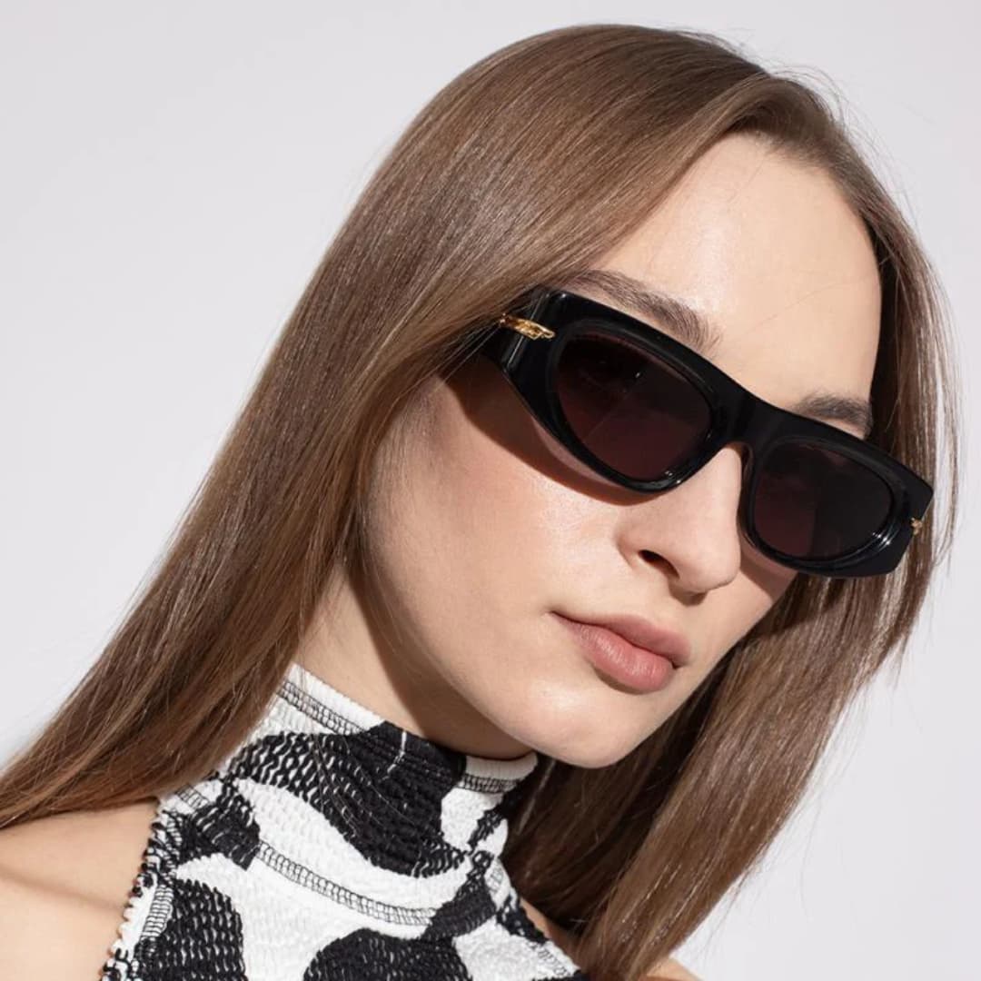 Parlak siyah asetat çerçeve, gri camlarla birleşince zamansız bir şıklık sunuyor.