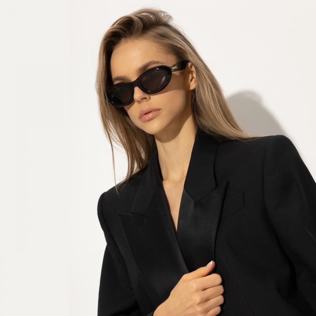 Stil: Lüks ve zarif kadın güneş gözlükleri - parlak siyah çerçeve ve gri camlarla klasik, zamansız bir görünüm