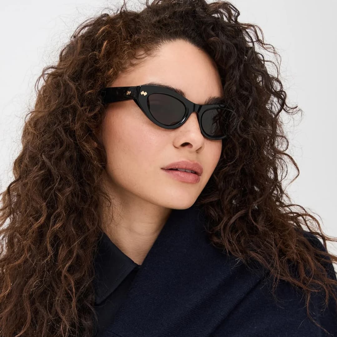 Stil: Moda öncüsü ve cesur bir tasarım; kalın asetatlı parlak siyah çerçeve, koyu kahverengi camlar ve saplardaki altın geometrik detaylar ikonik bir görünüm yaratıyor.