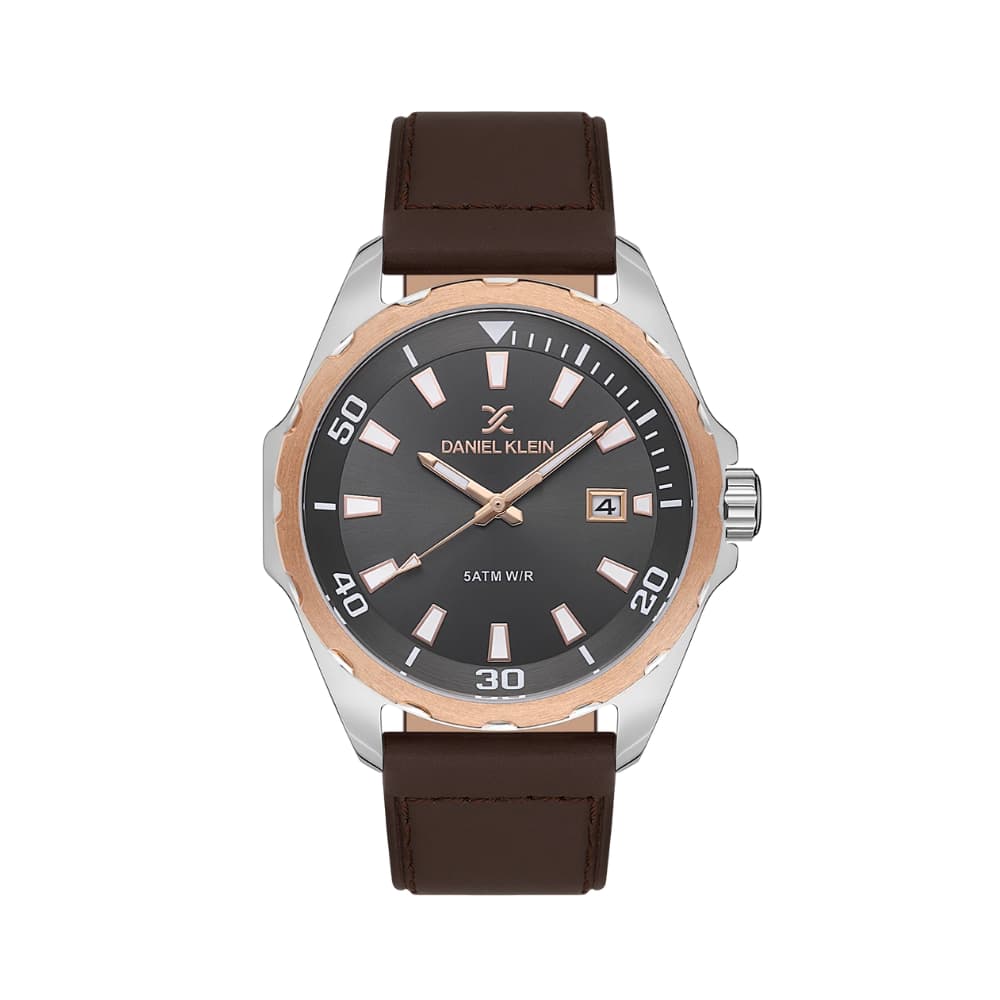 Güneş ışını dokusuna sahip kahverengi kadran, gümüş tonlu indeksler ve alt kadranlarla detaylandırılmış.