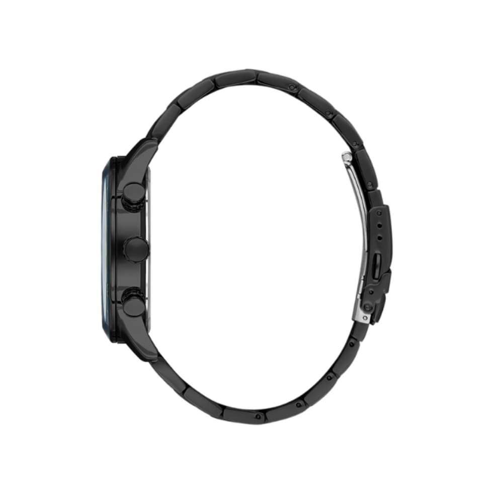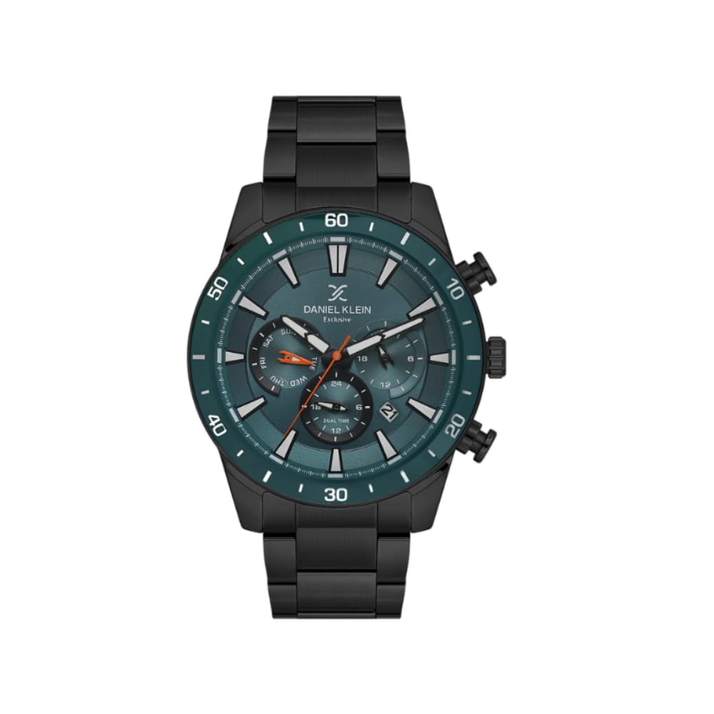 Turuncu detaylı alt kadranlar, gümüş indeksler ve floresan kollar, metalik petrol mavisi arka planda güçlü bir kontrast yaratıyor. Sportif ve modern çizgileri bir araya getiren dinamik bir tasarıma sahip.
