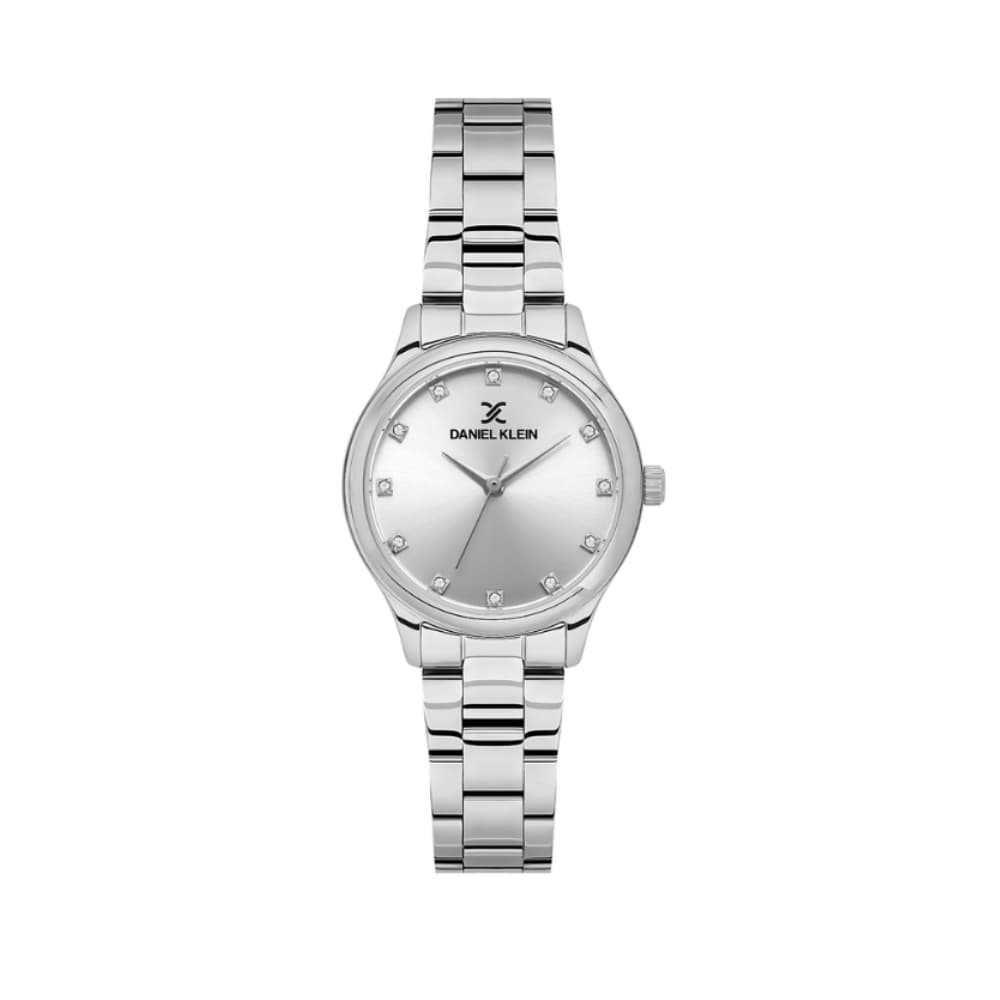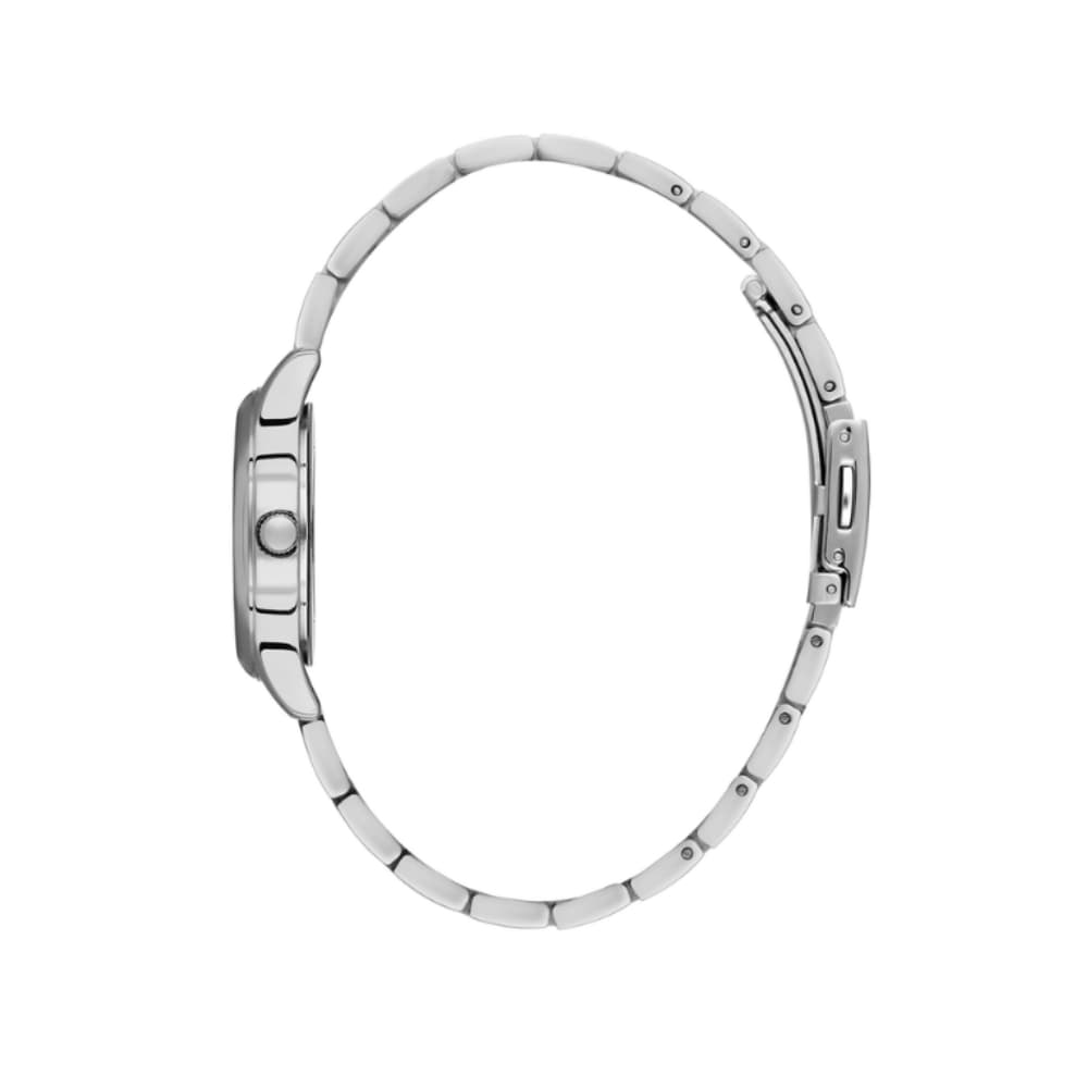 Mücevherli indekslere sahip sade ve zarif gümüş tonlu kadran, zarafeti vurgular. Minimalist çizgiler ve cilalı detaylar, bu modern kadın saatine zarafet katar.