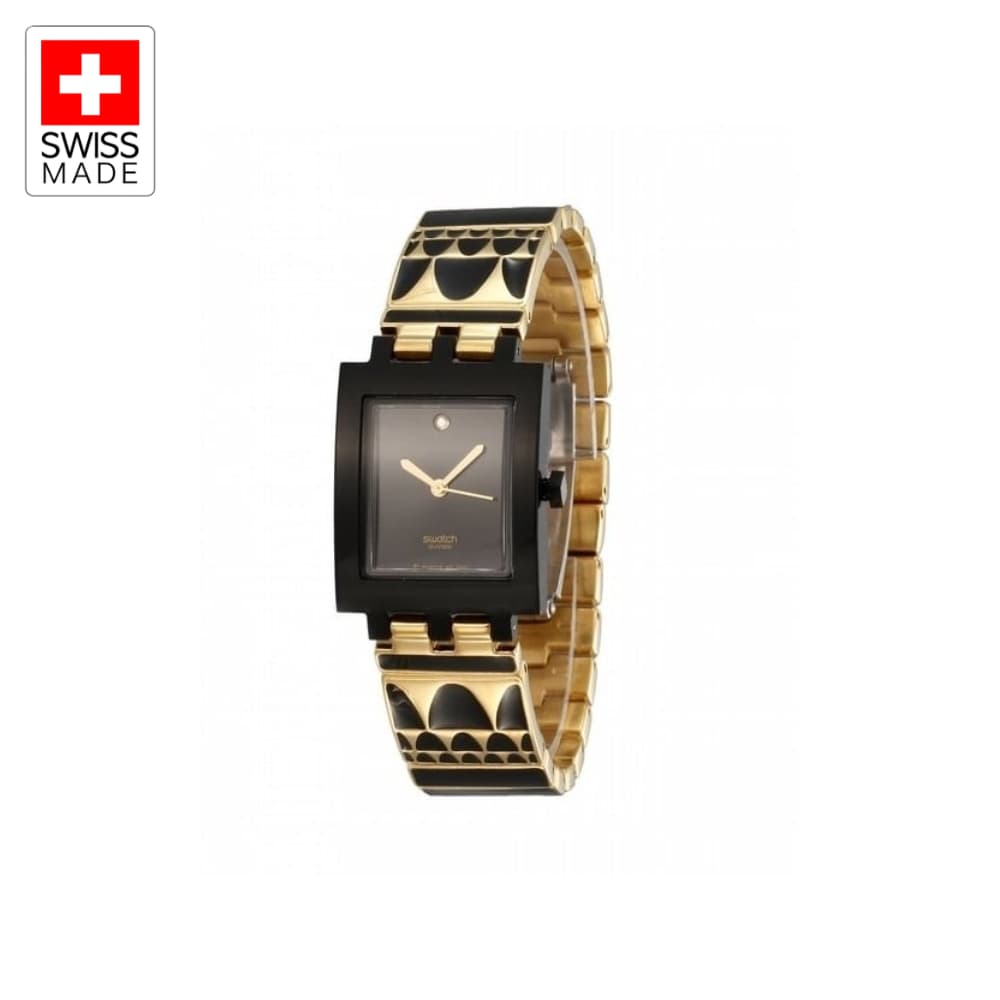 Kayış Detayları: Siyah geometrik desenlere, yüksek parlaklığa ve sofistike kontrasta sahip altın tonlu metal bilezik